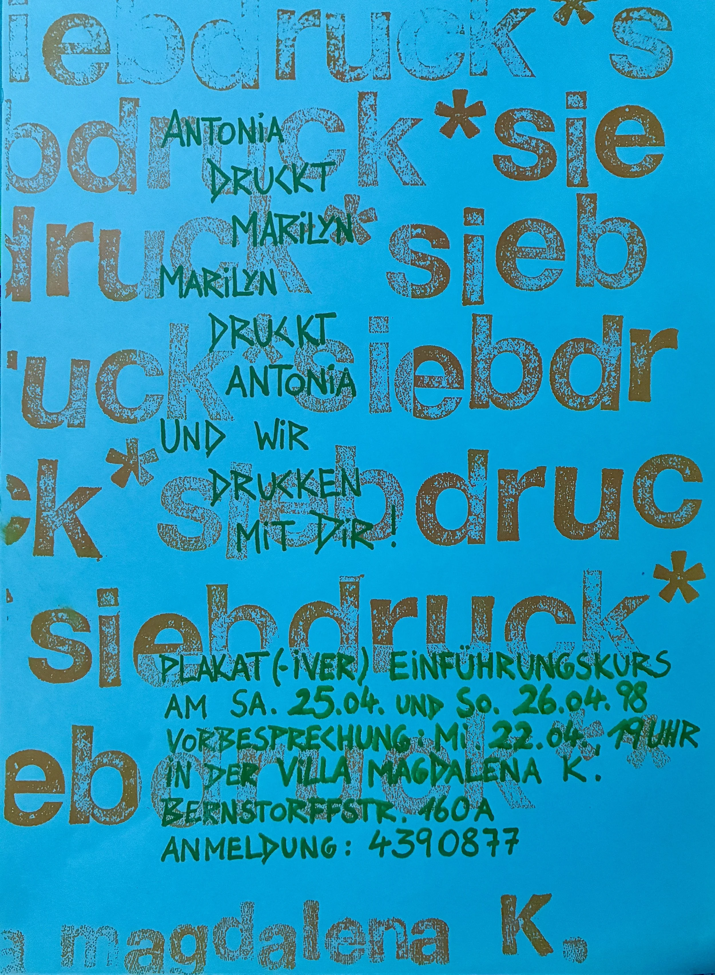 Die Figur Magdalena K. – ursprünglich Magdalena Keller – tauchte erstmals 1988 anlässlich der Volkszählung auf. Vier Frauen taten sich zusammen und trugen Schnipsel des Lebens von Magdalena Keller zusammen. Ist sie zunächst noch eine Fiktion, ein Spiel, wird Magdalena K. später zur Leitfigur und Hausbesetzerin.